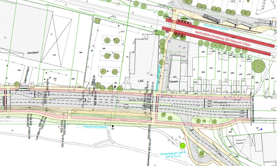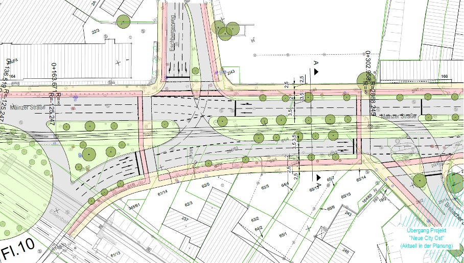 Die Nebenfahrbahn sowie deren Parkstände entlang der Mainzer Straße bleibt grundsätzlich erhalten, wird jedoch umfassend entsiegelt und begrünt. Neue Bäume werden gepflanzt, während ein Teil des bestehenden Baumbestands aufgrund seines Zustands entfernt werden muss.