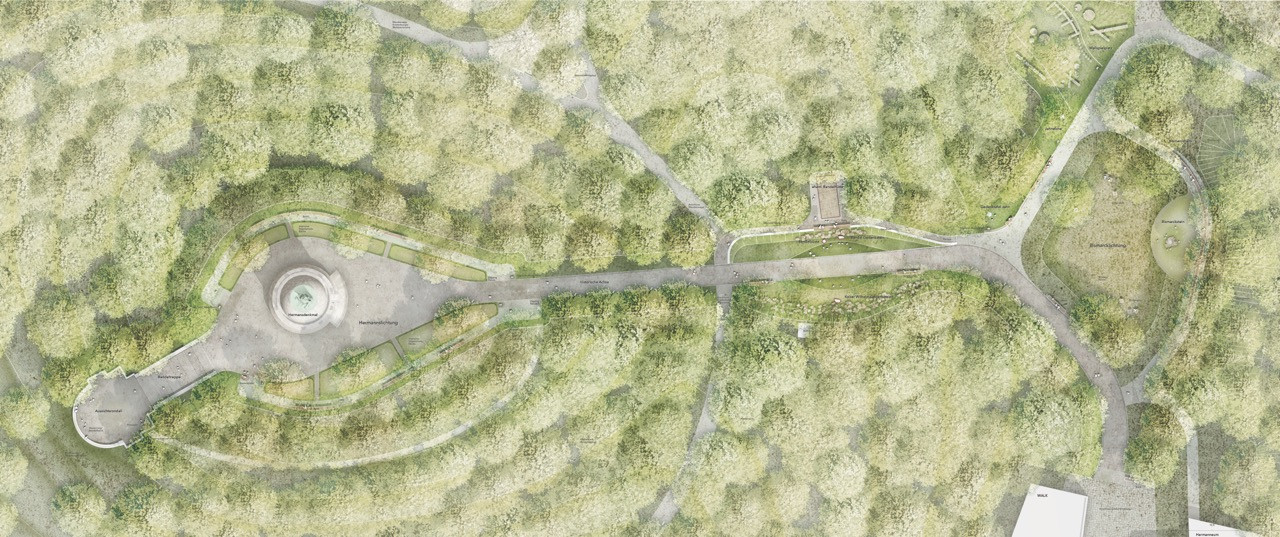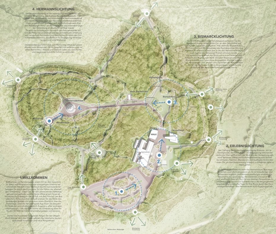 Die Arbeit entwickelt die Idee eines Panoramaparks, der die einzelnen Teilbereiche der Grotenburg zu einem Ensemble verbindet. Dabei wird das Leitbild des „Panoramas“ im doppelten Sinne verstanden: einerseits als Inszenierung des Aussichtspunkts und andererseits als Blick in die Zeitschichten des symbolisch aufgeladenen Ortes. Die vier Bereiche „Willkommen“, „Erlebnislichtung“, „Bismarcklichtung“ und „Hermannslichtung“ werden durch „Hermanns Höhenreise“, eine Abfolge aus Wegen und Lichtungen, miteinander verbunden.
